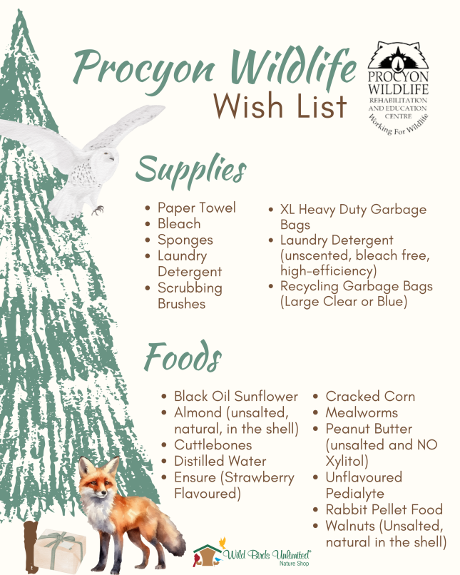 Wild Birds Unlimited Barrie is hosting a Food & Supply Drive all month long in support of Procyon Wildlife Centre, a licensed rehabilitation centre near Beeton, ON. Every year, their team helps hundreds of injured and orphaned wild animals recover and return to the wild. 🦝